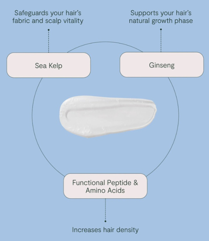 Sea Kelp, Ginseng, Burdock, Functional Peptide & Amino Acids assist to build hair strand resilience. Restores scalp vitality & assists to support the hair’s natural growth cycle for optimal scalp & hair health.